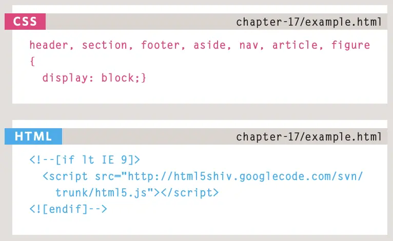 Хуучин браузерууд HTML5-ийг танихгүй учраас тэдгээрийг inline элемент гэж үздэг. Тиймээс хуучин браузерт зориулж дараах хэсгийг HTML болон CSS-дээ нэмэлтээр оруулж өгөх хэрэгтэй.