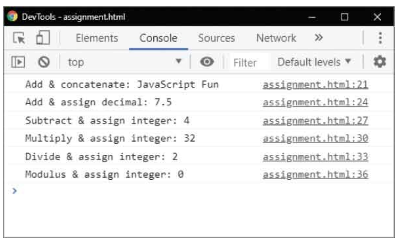 sum = 8; sum /= 4; console.log( 'Divide & assign: ' + sum ); // 2