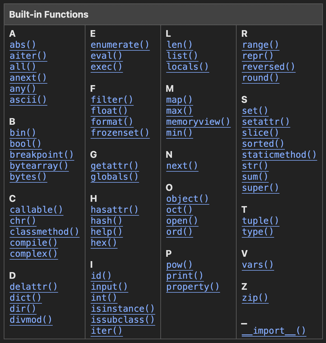 Python interpreter нь үргэлж бэлэн байдаг хэд хэдэн функц төрөлтэй.