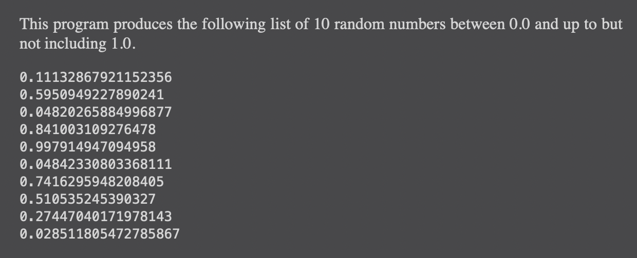 Random модуль нь хуурамч санамсаргүй тоо (цаашид би үүнийг зүгээр л "санамсаргүй" гэж нэрлэнэ) үүсгэдэг функцүүдийг санал болгодог. Random функц нь 0.0-ээс 1.0 хүртэлх (0.0-г оруулаад, харин 1.0-г оруулахгүй) хооронд санамсаргүй хөвөгч таслалтай тоог буцаадаг. Random-г дуудах бүрд та урт цувааны дараагийн тоог авдаг
